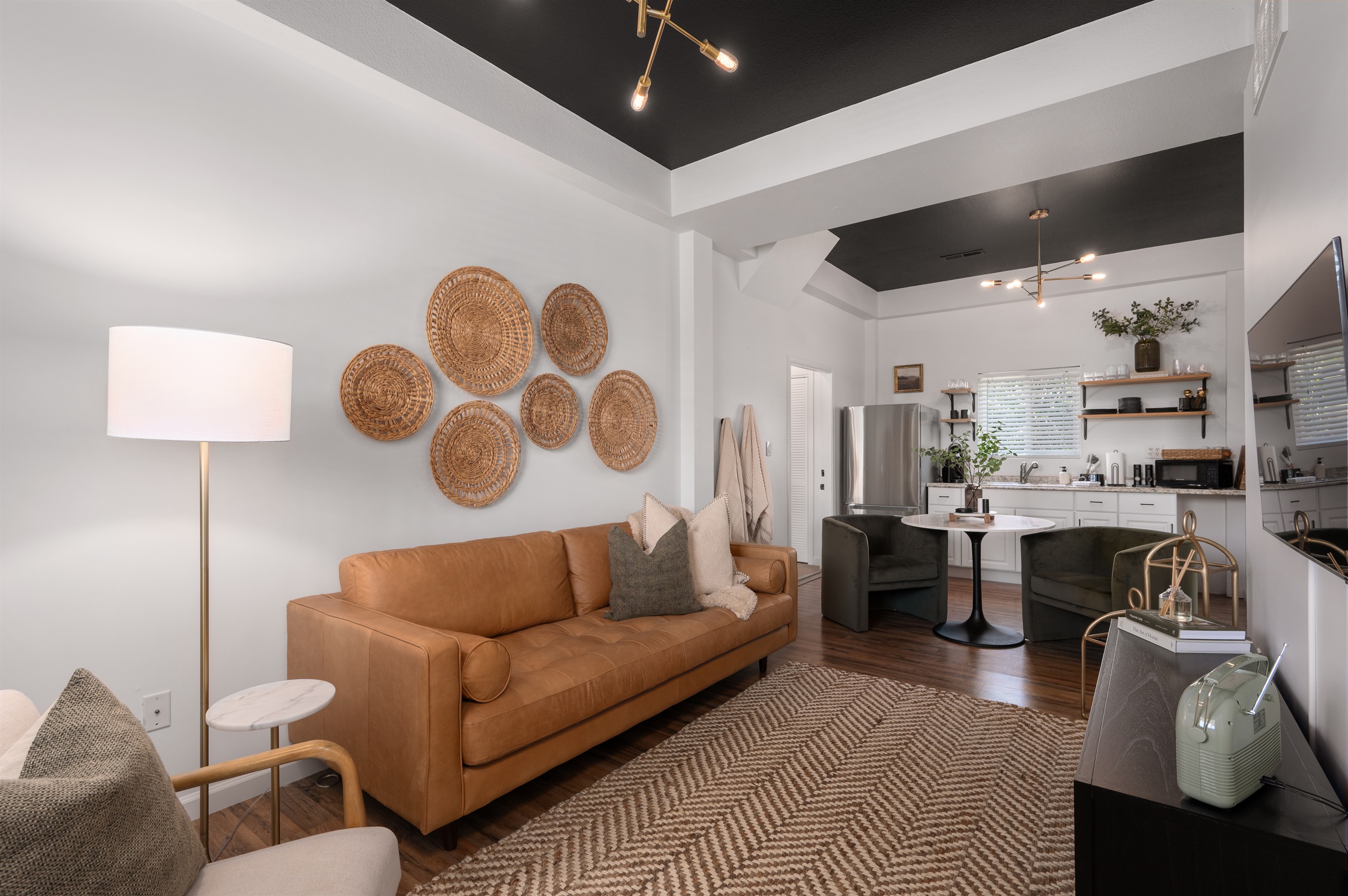 Camel leather sofa, grand mirror, throw pillows, blankets, 50" LCD TV (Netflix, Disney Plus, Amazon Prime).